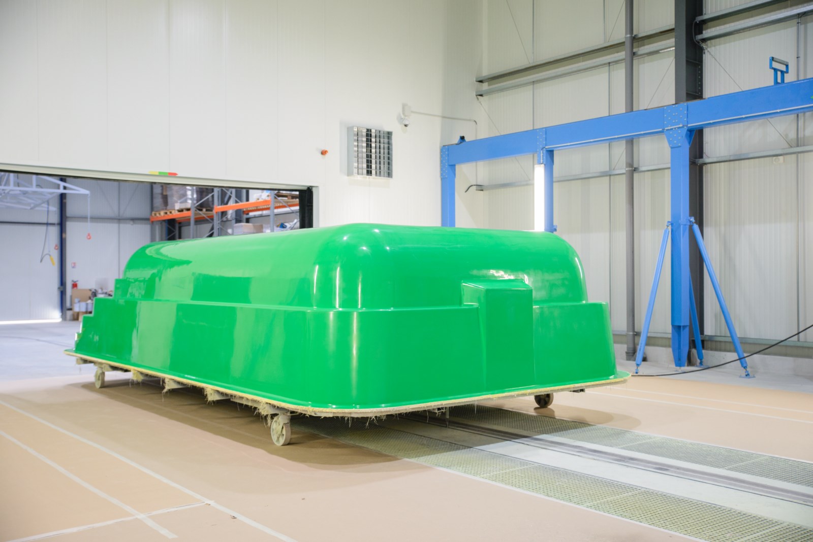 Notre usine est composée d'un CARROUSEL ovale passant de pièces en pièces sur lequel circulent nos moules de piscines. Ces moules sont motorisés et sont déplacés à l'aide d'une télécommande.