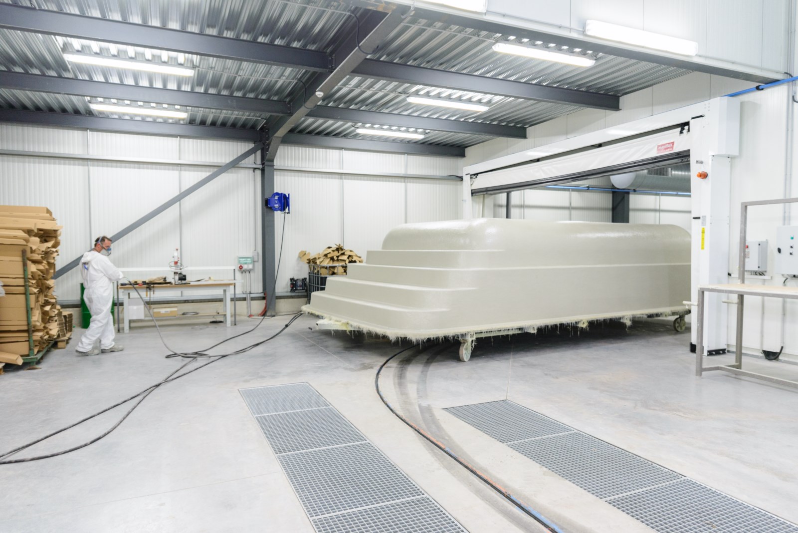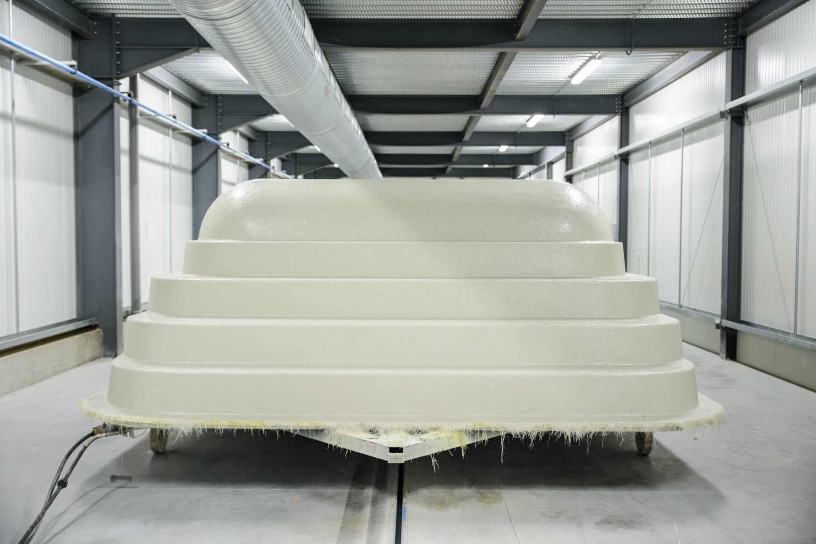 Après cette couche de projection parfaitement ébullée le moule de piscine est placé dans le TUNNEL D'ÉTUVE pour une polymérisation accélérée.