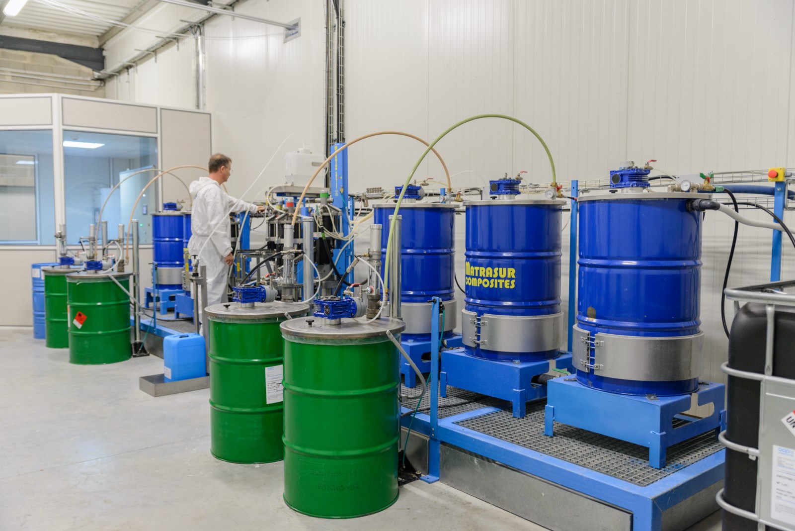 Chaque fût de matière est chauffé indépendamment en ayant pour but une appliquation dans des conditions optimales. Plusieurs fûts de mêmes matières sont communiquant avec des pompes de transfert afin qu'il y est un remplissage automatique et constant sans modifier les températures de GEL COAT ou RESINE.