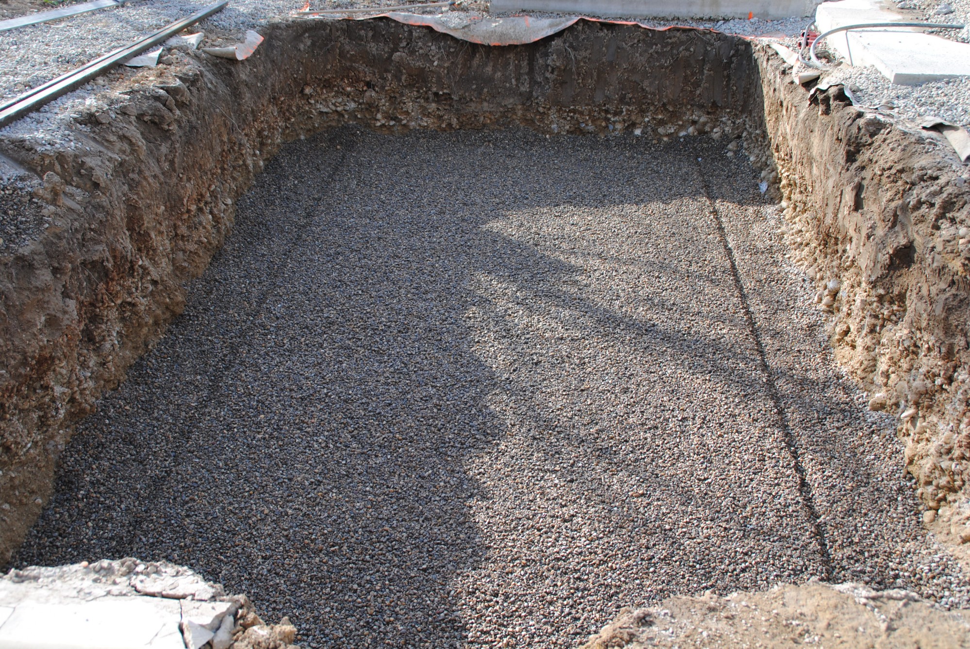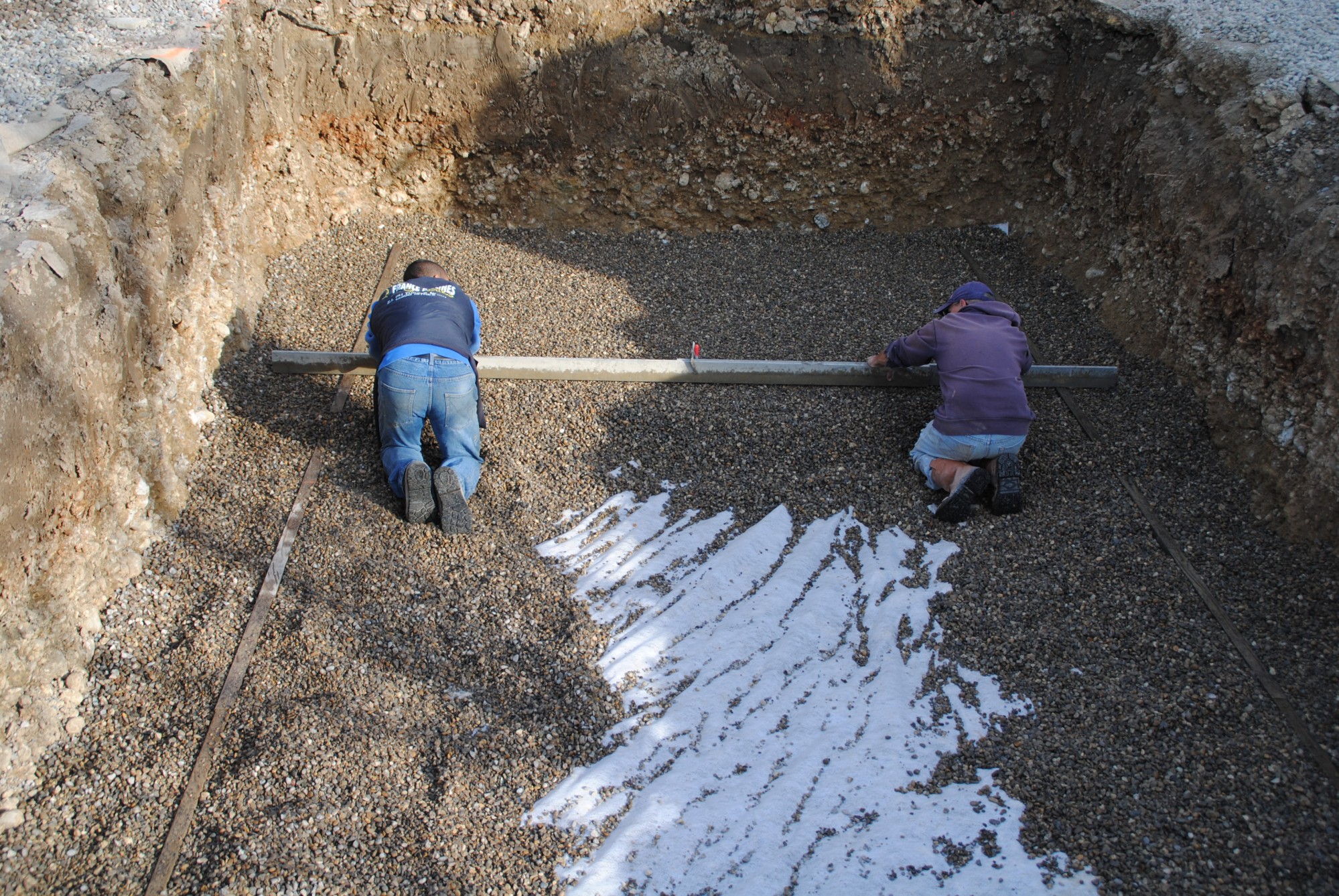 Une fois le radier tiré nous retirons nos règles et pouvons poser la piscine.