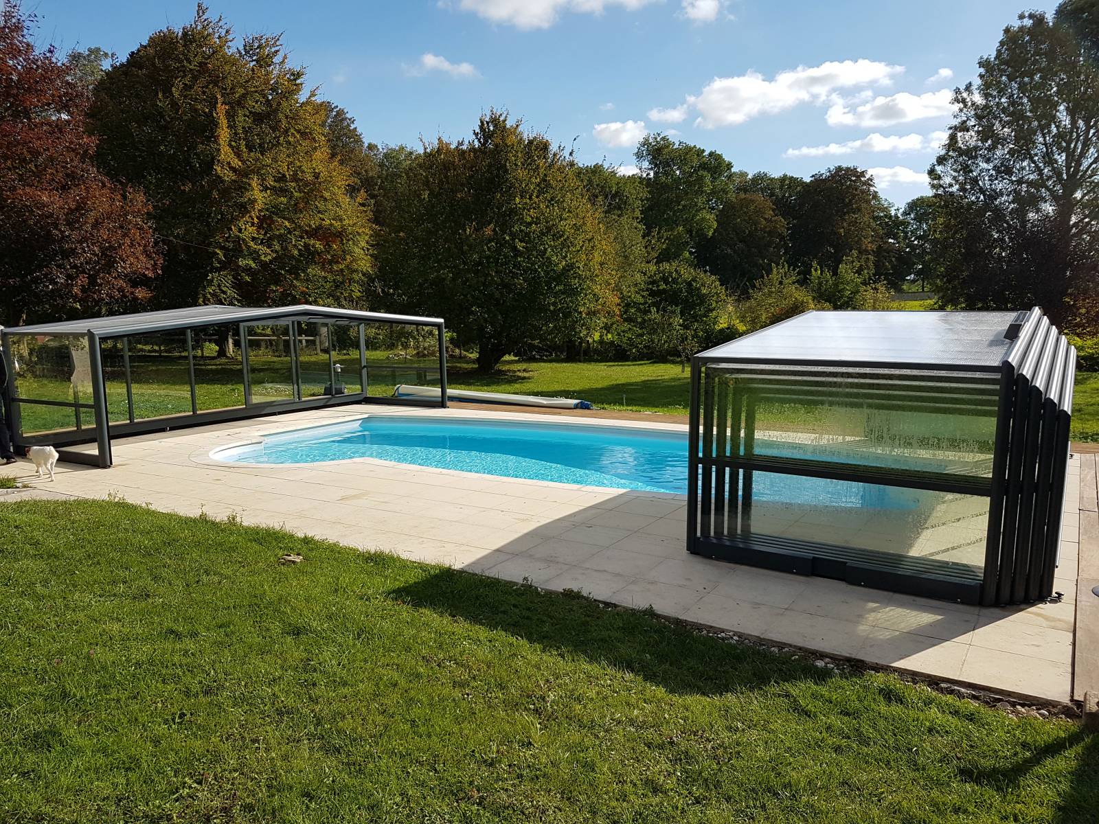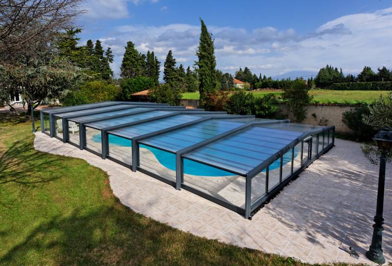 Déclic Piscines vous propose via son partenaire SOKOOL : un abri de piscine 3 angles télescopique Mi-haut CASSIOPÉE et adaptable à la quasi totalité de nos piscines.
